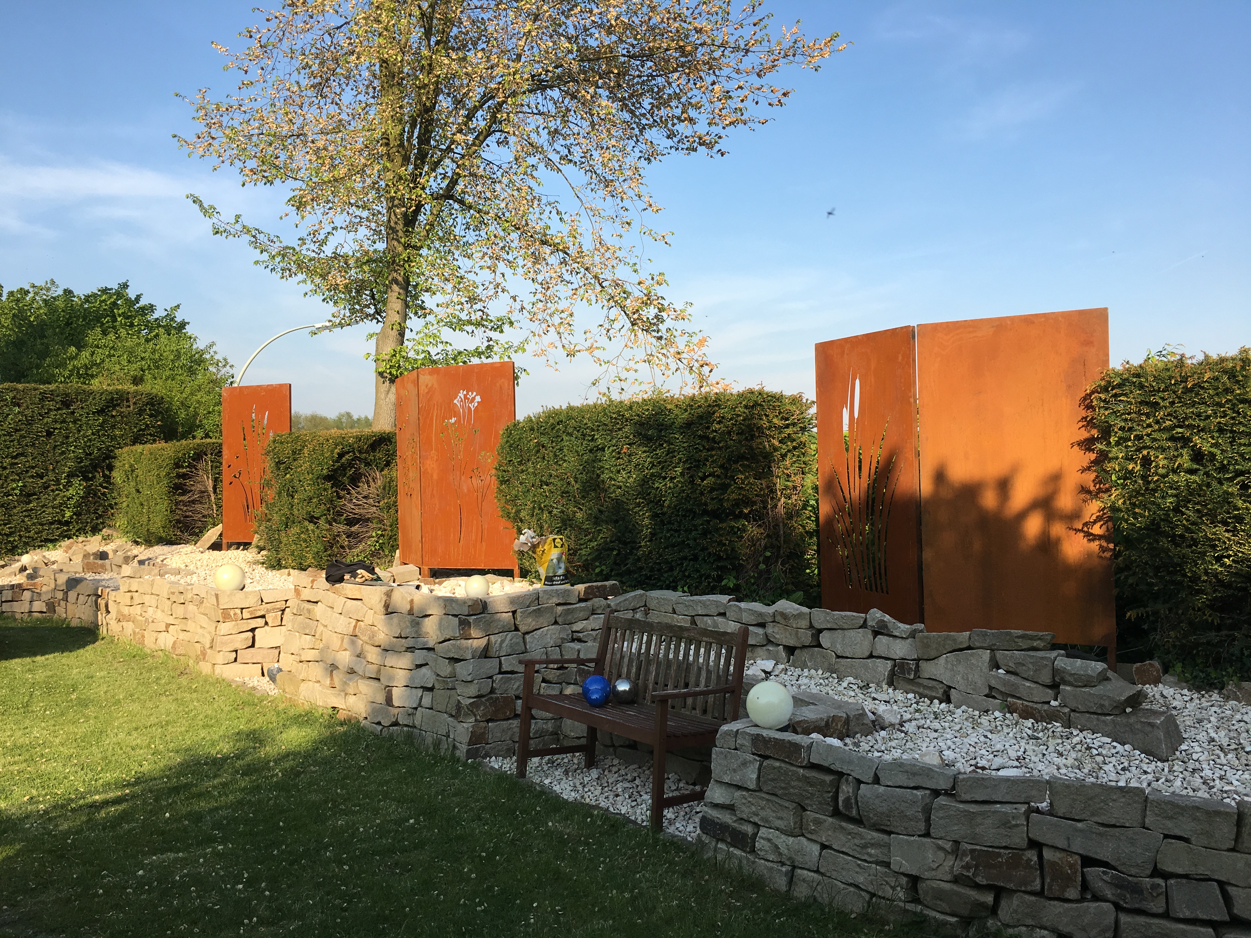 Die Garten-Stehlen wurden am 9.5.2017 von der Firma FWO-Metallverarbeitung geliefert und sofort wurde mit dem Einbau begonnen. Und so sieht nun alles aus.